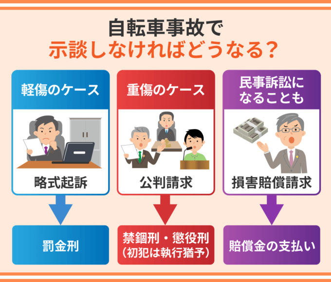 示談が成立しない場合、被害者が軽傷であれば、加害者に重過失があっても、略式起訴され罰金刑になる可能性が高いです。罰金は刑事罰ですので前科がつくことになります。