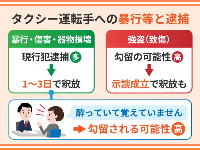 タクシー運転手への強盗(致傷)については、勾留される可能性が非常に高いですが、勾留期間内に示談が成立すれば、起訴されず釈放される余地があります。