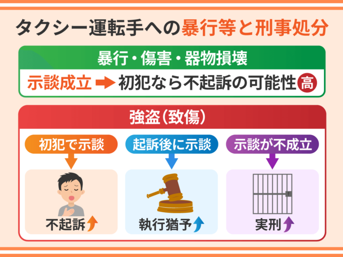 初犯でタクシー運転手が重傷を負っていなければ、示談が成立すれば不起訴になる余地は十分にあります。もし起訴されても示談が成立していれば、執行猶予を獲得できる可能性が高いです。示談が成立しなければ初犯でも実刑になる可能性が十分にあります。