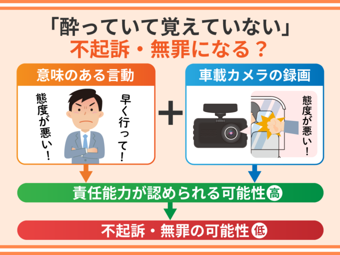 そのため、酔っていて覚えていないと主張し続けて不起訴や無罪になることはないでしょう。