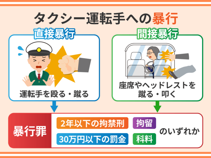 タクシー運転手に対して殴る、蹴るといった暴力を振るったときは、暴行罪が成立します。刑罰は、①2年以下の拘禁刑、②30万円以下の罰金、③拘留、④科料のいずれかです。