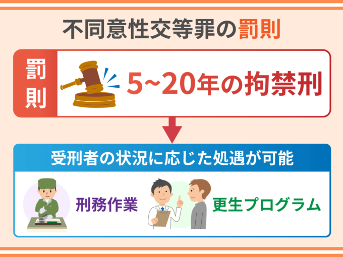 不同意性交等罪の罰則は5年から20年の拘禁刑です。