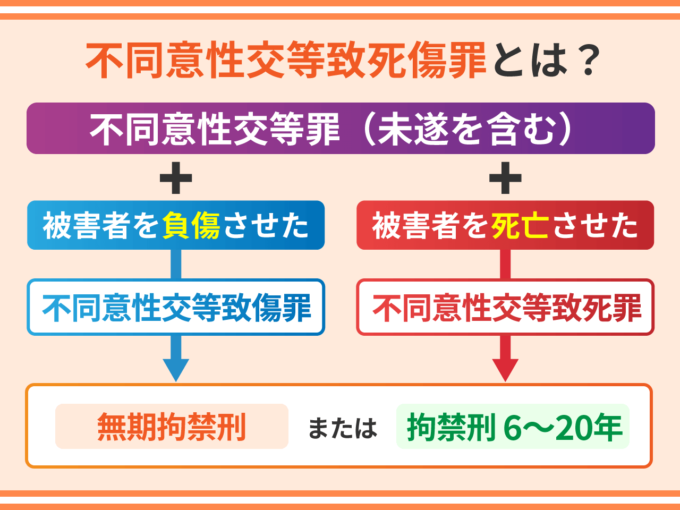 不同意性交等罪を犯して被害者を負傷させた場合は、不同意性交等致傷罪が成立します。被害者を死亡させた場合は不同意性交等致死罪が成立します。