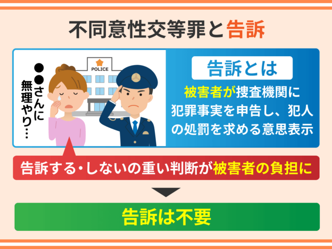 かつての強姦罪は起訴にあたって被害者の告訴が必要とされていましたが、告訴する・しないの重い判断を被害者に委ねると負担になることから、不同意性交等罪では告訴は不要とされています。