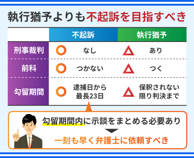 そのため、執行猶予よりもまずは不起訴を狙うべきです。不同意性交等の容疑を認める場合、不起訴となるためには最長20日の勾留期間内に被害者との間で示談をまとめることが必要です。