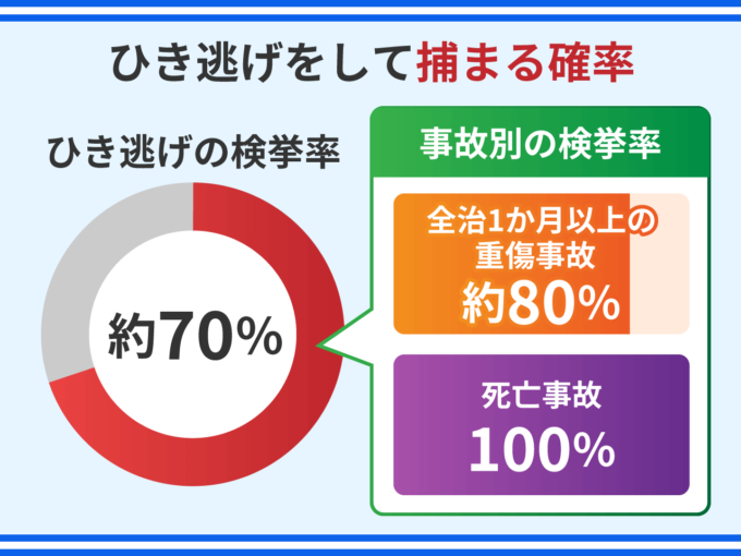 令和5年版犯罪白書によれば、ひき逃げの検挙率は69.3%です。そのうち全治1か月以上の重傷事故の検挙率は79.4%、死亡事故の検挙率は101%です。防犯カメラの発達などにより年々、検挙率が上がっています。