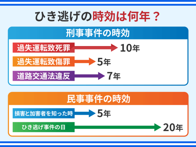 ひき逃げは刑事・民事の両方で事件化することがあります。ひき逃げの時効は刑事事件と民事事件で以下のように異なります。