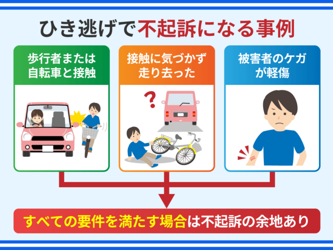 不起訴になれば処罰されることはありませんし、前科がつくこともありません。被疑者にとって最も軽い処分といえます。ひき逃げで最も不起訴になりやすい事例は以下の3つの要件を全て満たすケースです。