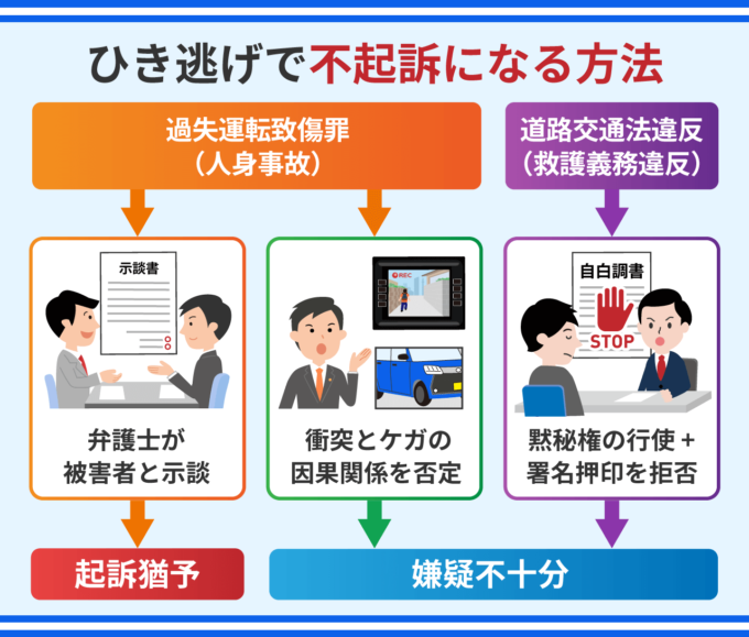上で挙げたひき逃げの事例では、過失運転致傷罪と道路交通法違反の双方で不起訴になる余地が十分にあります。なぜそのように言えるのでしょうか?