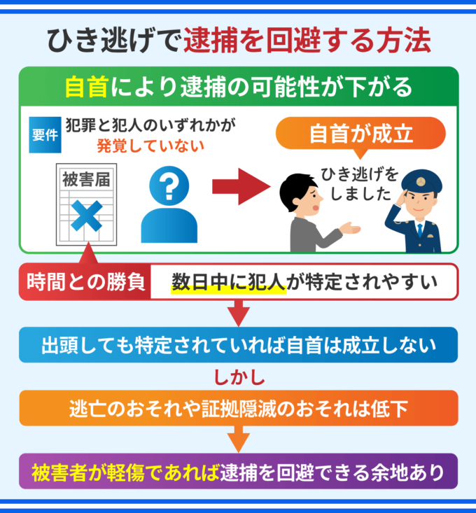 ひき逃げで逮捕を回避する方法として、自首することが考えられます。自首とは捜査機関に出頭し、自発的に犯した罪を申告して処分を求めることです。