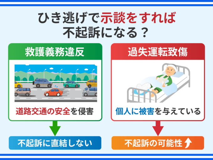 過失運転致傷罪については、被害者と示談をすれば「起訴猶予」で不起訴になる可能性が高まりますが、救護義務は公法上の義務ですので、被害者個人と示談をしたからといって、必ずしも起訴猶予で不起訴になるわけではありません。