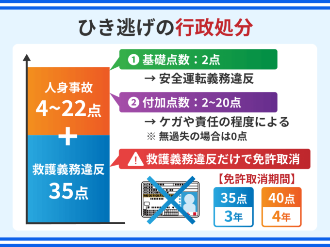 救護義務違反の行政処分は35点で、一発で運転免許が取り消されます。免許停止等の前歴や他の違反がなければ、運転免許を取得できない欠格期間は3年です。免許停止等の前歴があれば欠格期間は4年以上になります。