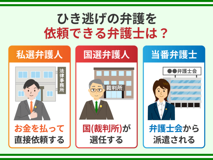 ひき逃げ事件の弁護を依頼できる弁護士は、私選弁護人、国選弁護人、当番弁護士の3種類です。個別に見ていきましょう。