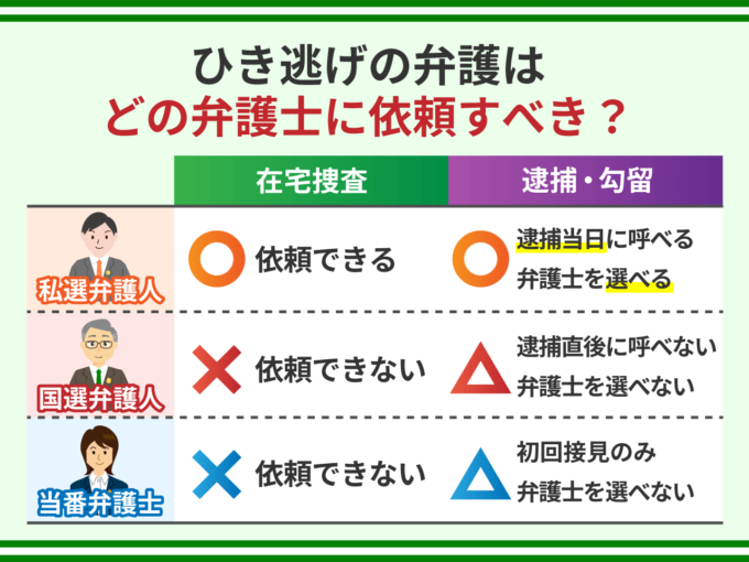 ひき逃げ事件で在宅捜査を受けている場合は、当番弁護士や国選弁護人に依頼することはできません。依頼できるのは私選弁護人のみとなります。