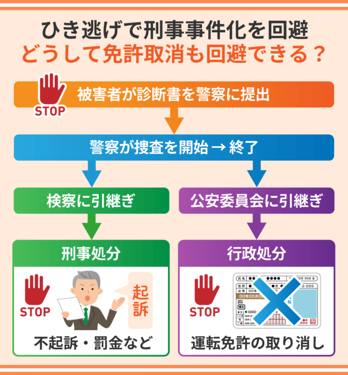ひき逃げの被害者に診断書の提出を控えてもらえれば、免許取消も回避できることが多いです。運転免許の取り消しは行政処分です。行政処分は、「不起訴」、「罰金」、「執行猶予」といった刑事処分とは別の処分になります。