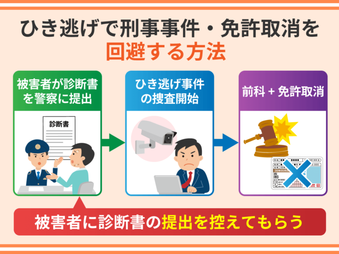 ひき逃げで刑事事件・免許取消を回避する方法は、被害者に診断書の提出を控えてもらうことです。