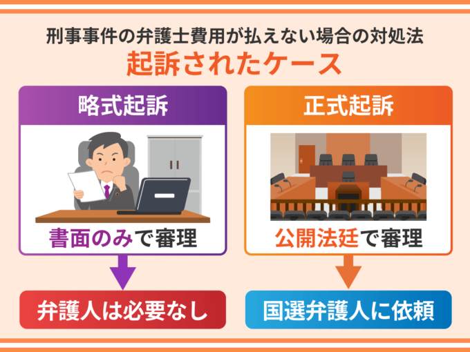 略式起訴されると法廷が開かれずに書面のみで審理されるため、弁護活動をする余地がありません。そのため、略式起訴された場合は、弁護人を選任する必要がないため、弁護士費用を払えないことは問題にはなりません。