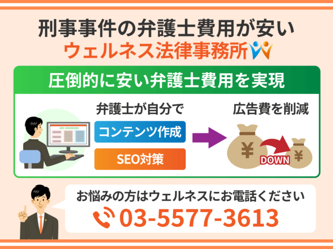 「刑事事件の弁護士費用を払えない」とお悩みの方は、ウェルネス法律事務所(03-5577-3613)にお電話ください。