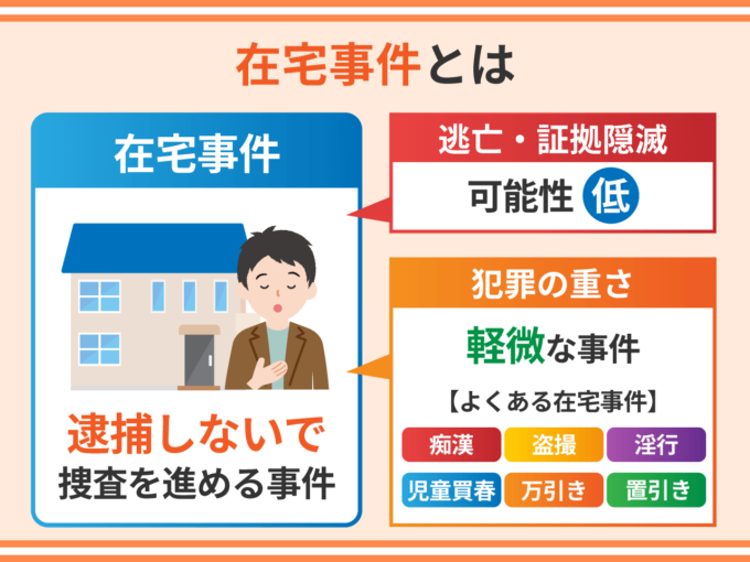 在宅事件とは被疑者を逮捕しないで捜査を進める事件です。これに対して、被疑者を逮捕して捜査を進める事件を身柄事件といいます。