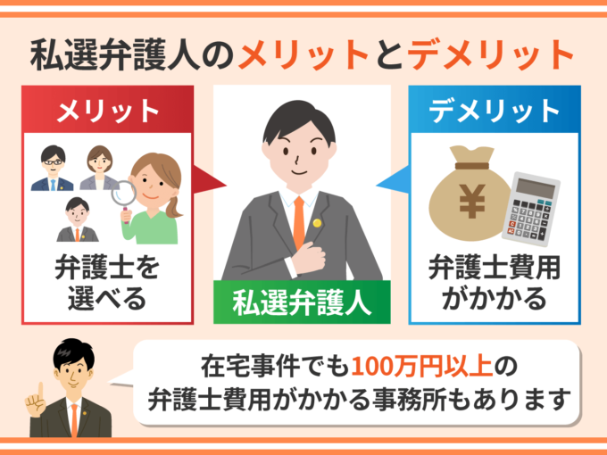 私選弁護人のメリットは、当番弁護士や国選弁護人と異なり、自分で弁護士を選べるという点です。デメリットは弁護士費用がかかるという点です。