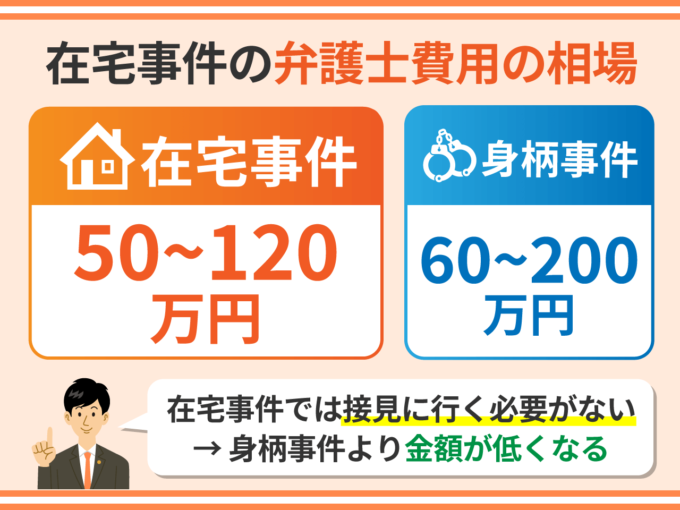 在宅事件の弁護士費用の相場は50万円~120万円です。これに対して身柄事件の弁護士費用の相場は60万円~200万円です。