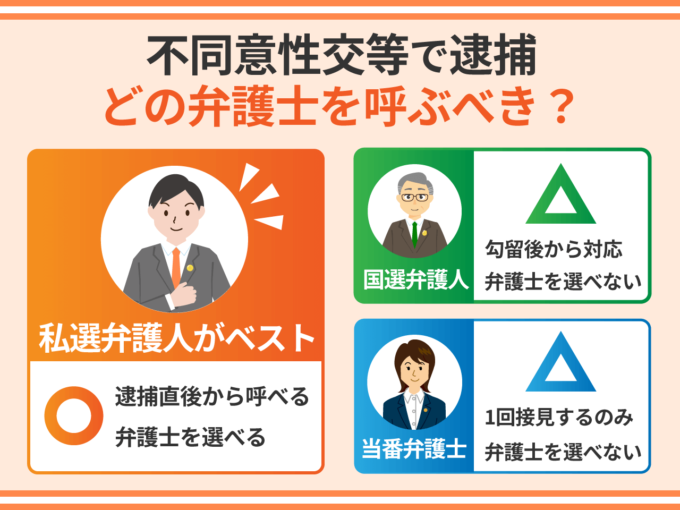 不同意性交等で逮捕された場合、弁護士費用を準備できる場合は、私選弁護人に依頼するのがベストです。私選弁護人なら逮捕直後から呼べますし、依頼者の側で、不同意性交等に強い弁護士を選ぶことができるからです。
