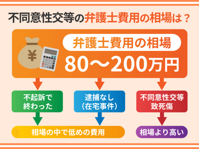 不同意性交等の弁護士費用の相場は、逮捕されたケースで総額120万円から200万円、逮捕されていないケースで総額80万円から200万円です。