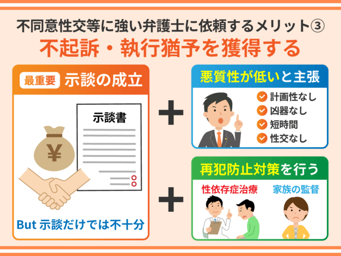 - 不同意性交等に強い弁護士に依頼するメリット⑤-不起訴・執行猶予を獲得する