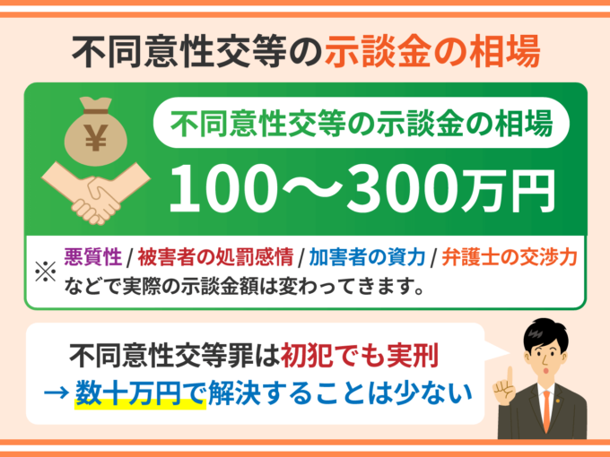 不同意性交等の示談金の相場は100万円~300万円です。不同意性交等罪は初犯でも実刑になりうる重大犯罪ですので、痴漢や盗撮のように数十万円で解決するケースは少ないです。