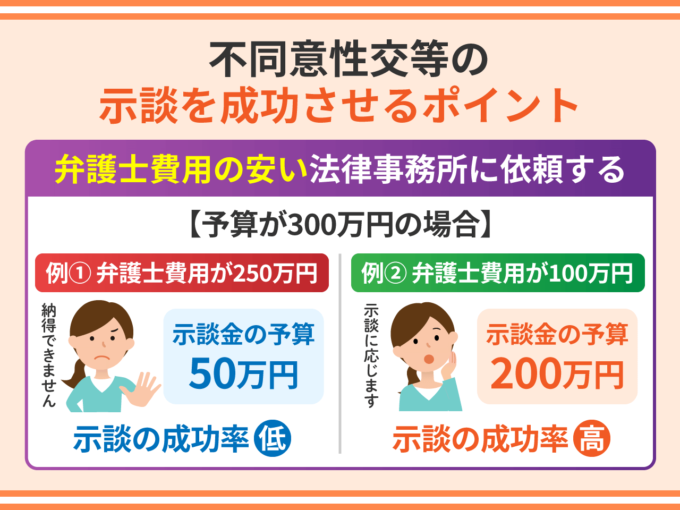 【具体例】 ①予算が300万円・弁護士費用が250万円の場合⇒示談金の予算として50万円しか確保できない ②予算が300万円・弁護士費用が100万円の場合⇒示談金の予算として200万円を確保できる |
