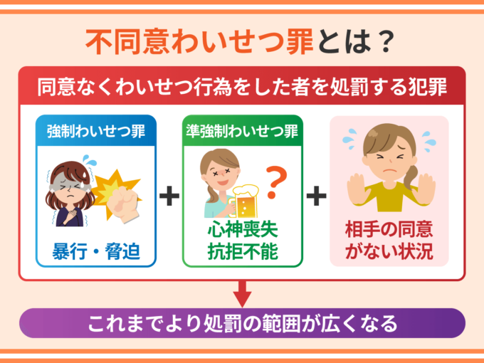 不同意わいせつ罪とは、同意なくわいせつ行為をした者を処罰する犯罪です。従来の強制わいせつ罪と準強制わいせつ罪を統合する形で新たに創設されました。