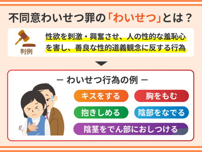 不同意わいせつ罪の「わいせつ」行為とは、性欲を刺激・興奮させ、人の性的な羞恥心を害し、善良な性的道義観念に反する行為のことです。以下の行為がわいせつ行為にあたります。