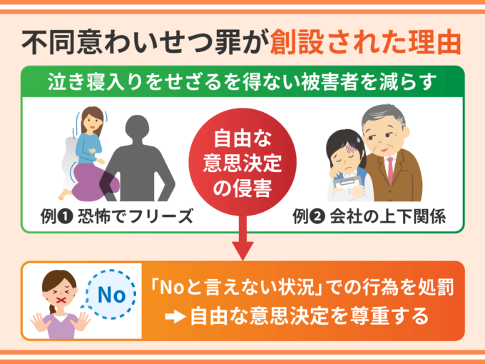 そこで、自由な意思決定を尊重するため不同意わいせつ罪を創設し、「やめてください!」と言えない状況でわいせつな行為をした場合に処罰することにしたのです。