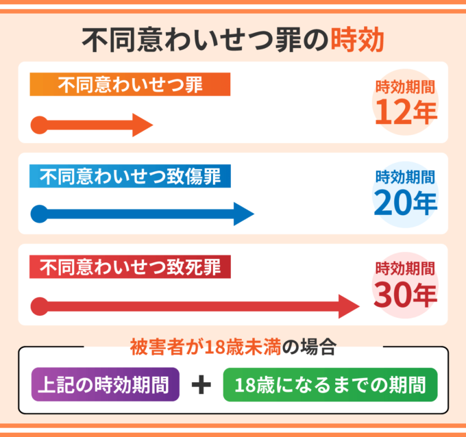 不同意わいせつ罪の時効は12年です。強制わいせつ罪の時効は7年でしたが、性犯罪の被害を訴えるのに長期間かかるケースが多いことから、5年延長されました。
