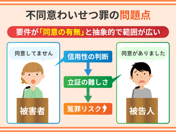 これに対して、不同意わいせつ罪の場合は、暴行・脅迫にとどまらず広く同意の有無が問題となります。そのため、被害者が言っていることの信用性を判断するのがより難しくなり、結果的に冤罪の発生するリスクが高まるといえるでしょう。