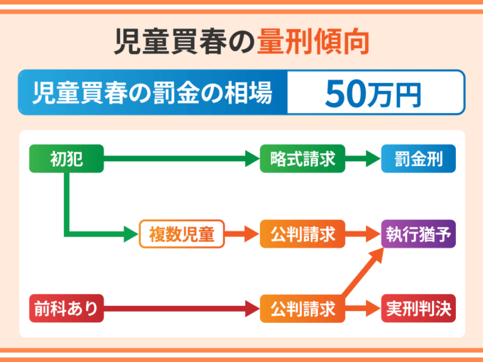 性犯罪の前科がある場合は公判請求される可能性が高くなります。初犯であっても、複数の児童との買春行為で立件されている場合は、公判請求されることがあります。