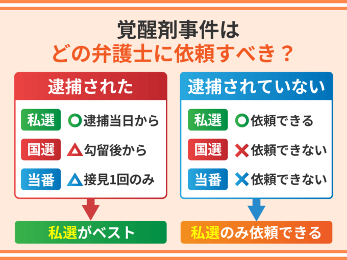 覚醒剤で逮捕されたら、弁護士費用はかかりますが、私選弁護人に依頼するのがベストです。私選弁護人であれば逮捕当日から活動を始めることができます。また、依頼する側で弁護士を選ぶことができるため、覚醒剤事件に強い弁護士を探して依頼することができます。