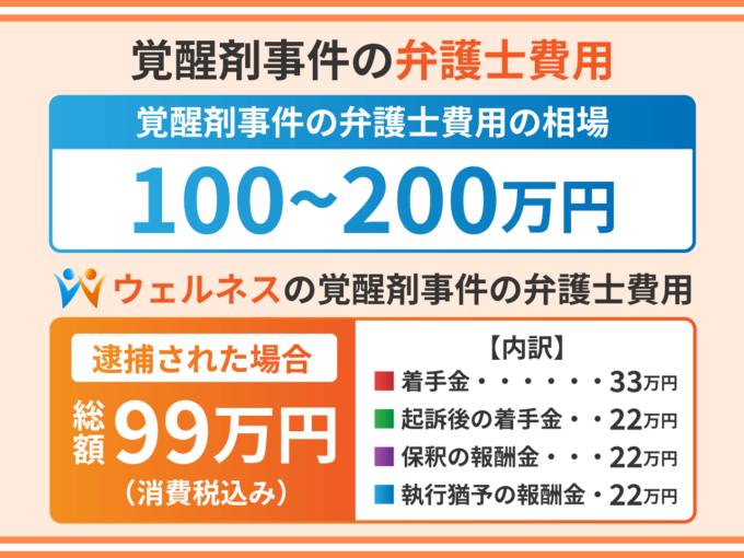 【ウェルネスの覚醒剤事件の弁護士費用】 覚醒剤で逮捕された場合は総額99万円(税込)になることがほとんどです。 (内訳) ・着手金…33万円 ・起訴後の着手金…22万円 ・保釈の報酬金…22万円 ・執行猶予の報酬金…22万円