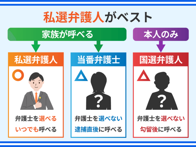 国選弁護人は身柄拘束された本人しか呼べませんし、呼べるタイミングも勾留された後になってしまいます。当番弁護士は逮捕直後に呼べるものの、「弁護士を選べない」というデメリットがあります。