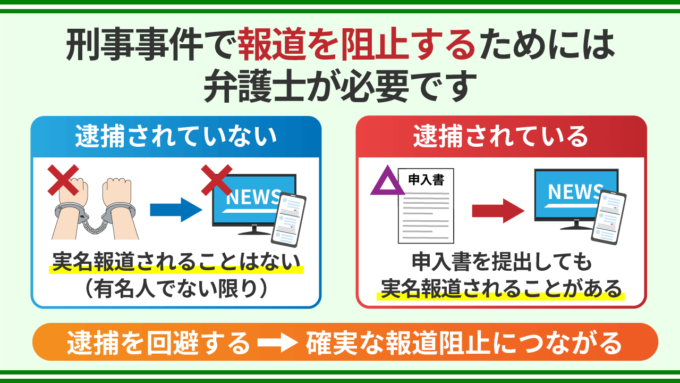 これに対して、逮捕されれば一般の方でも実名報道されるリスクがあります。逮捕直後に弁護士が警察署長に対して、報道しないよう求める申入書を提出することはできますが、効果は限定的です。確実に報道を回避するためには、逮捕を回避することが必要になります。