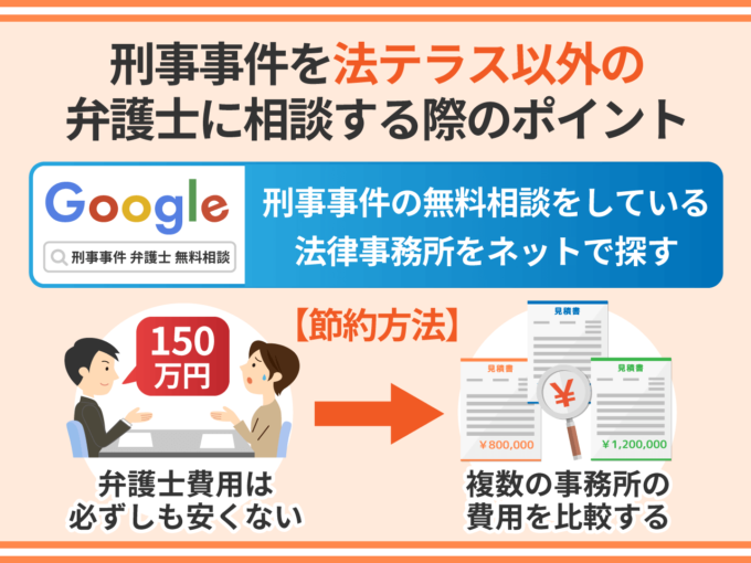 上で説明したように、法テラスに刑事事件を相談することはできませんが、法テラスでなくても、刑事事件の無料相談に対応している法律事務所は多々あります。「刑事事件 弁護士 無料相談」等の検索ワードで事務所を調べてみてください。
