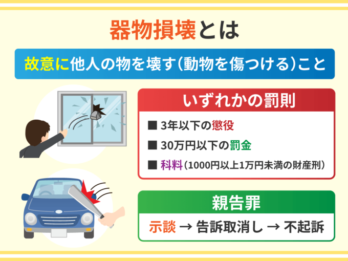器物損壊とは、故意に他人の物を壊すことです。故意に他人の動物を傷つけた場合も器物損壊になります。過失で壊したり傷つけた場合は、単なる物損事故であり器物損壊になりません。