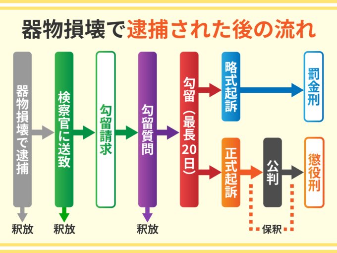 器物損壊で逮捕されると、48時間以内に検察庁へ連行され、検察官の取調べを受けます。検察官に勾留請求されると、当日または翌日に裁判官の勾留質問を受け、勾留されるか釈放されるかが決まります。