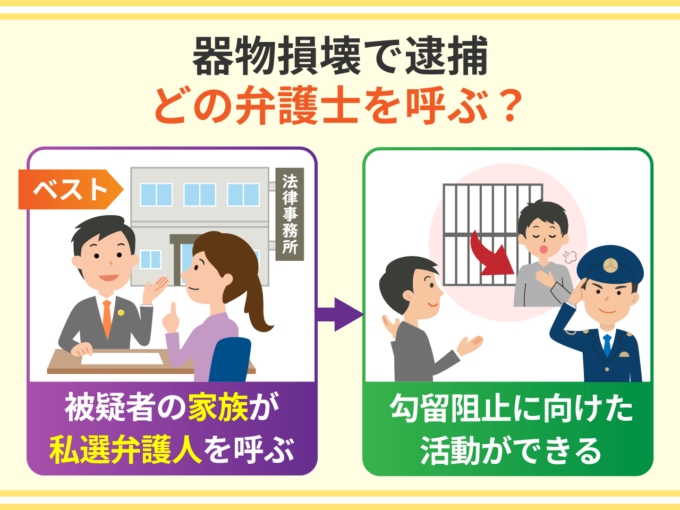 器物損壊で逮捕された場合、家族が私選弁護人を呼ぶのがベストです。