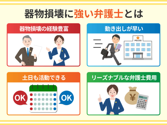 器物損壊に強い弁護士とは次の4つの条件を満たす弁護士です。