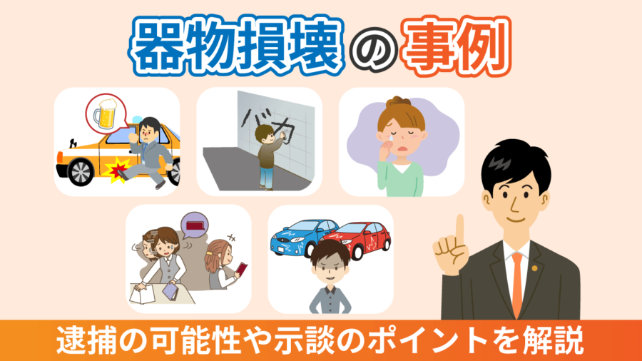 器物損壊のなかには様々な事例があります。このページでは器物損壊の代表的な5つの事例を紹介し、事例ごとに逮捕・勾留の可能性や示談のポイントを解説しました。ぜひ参考にしてみてください。