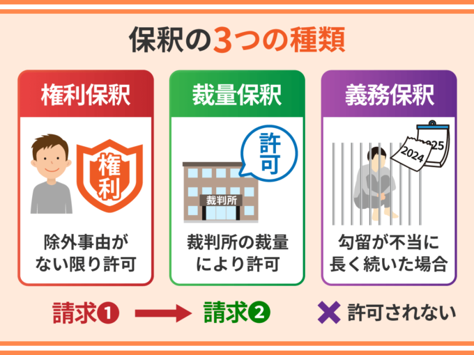保釈には権利保釈・裁量保釈・義務保釈の3つの種類があります。