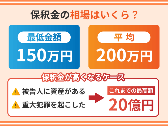 保釈金の相場は200万円です。被告人が資産家であったり、重大犯罪で長期の実刑判決が予想されるケースでは、保釈金は200万円よりも高くなります。これまでの保釈金の最高額は20億円です。