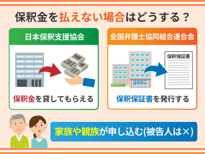 保釈金を用意できないときは日本保釈支援協会か全弁協(全国弁護士協同組合連合会)の利用を検討することになります。