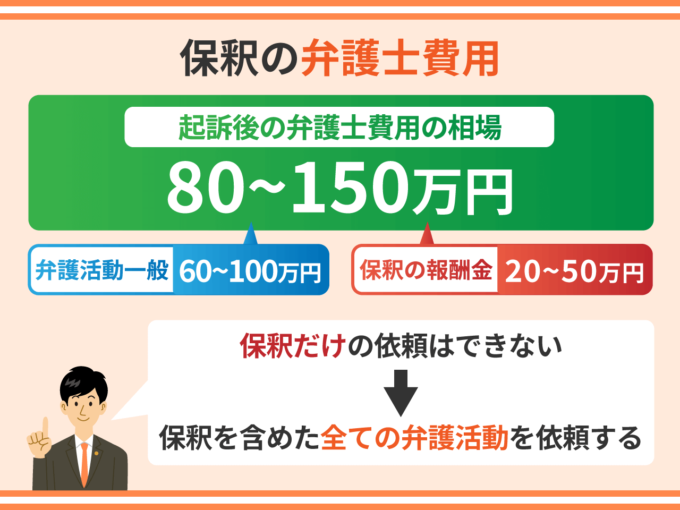 起訴後の弁護活動全般を私選弁護人に依頼する場合、保釈の成功報酬を含む弁護士費用の相場は80万円~150万円です。